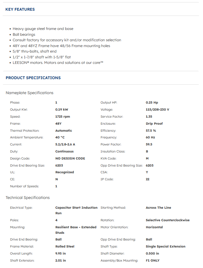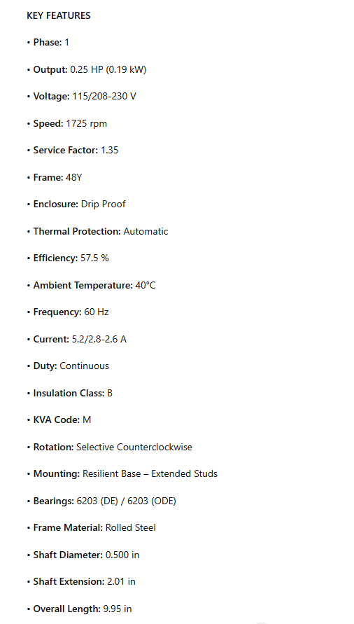 B313, Fan and Blower Motor, 0.25Hp, 1 Ph, 60 Hz, 115/208-230 V, 1725 RPM, 48Y Frame, DP, 48C17D2042P