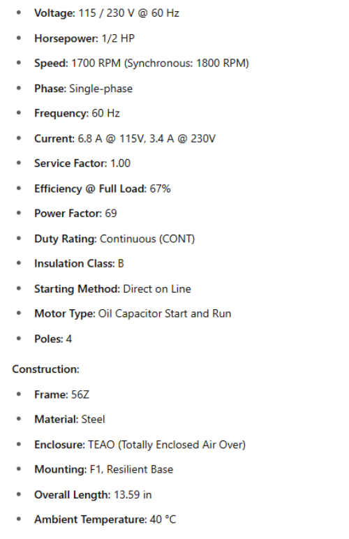 Speed: 1700 RPM (Synchronous: 1800 RPM)