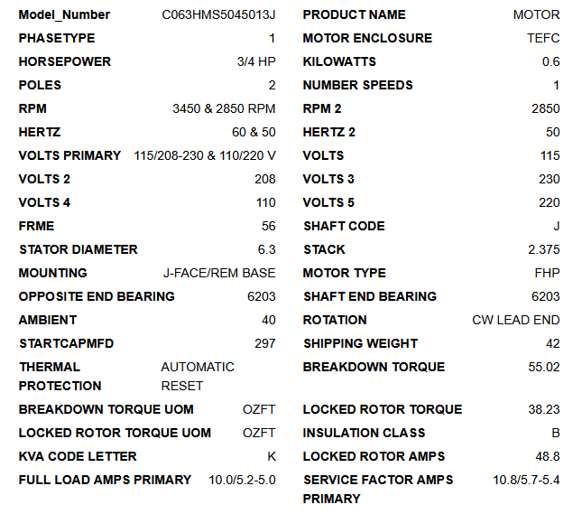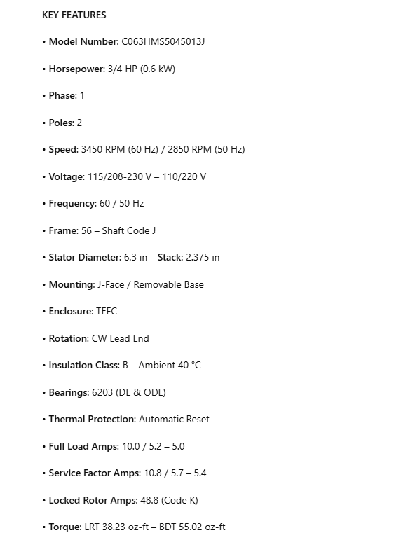 EU05, Commercial Pump Motors, 3/4Hp, 3450/2850 RPM, 115/208-230V, 1PH, 60/50Hz, TEFC, Frame 56J, C063HMS5045013J