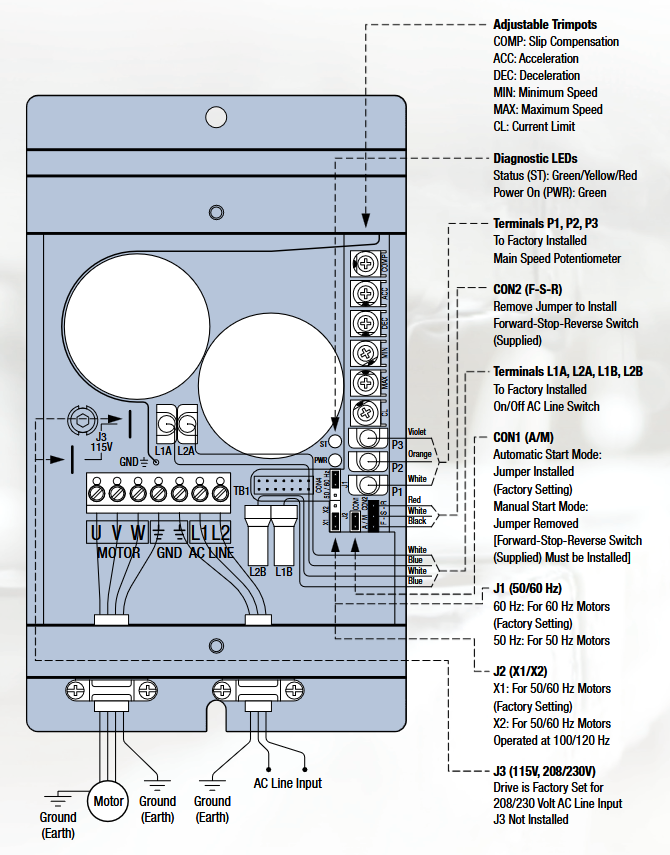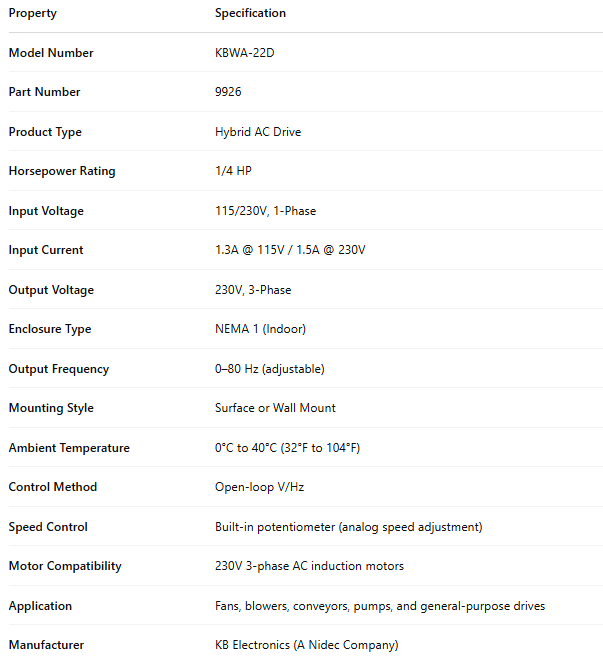 9926, (KBWA-22D) Hybrid AC Drive 1/4Hp 1.3A-1.5A 115/230V 1PH Input 230V 3PH Output NEMA 1 Enclosure