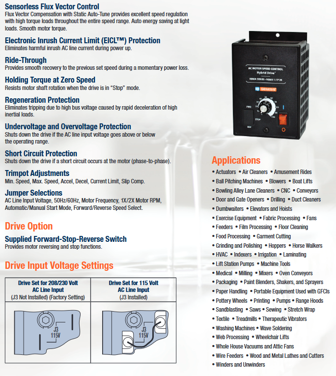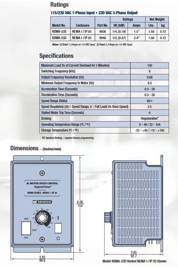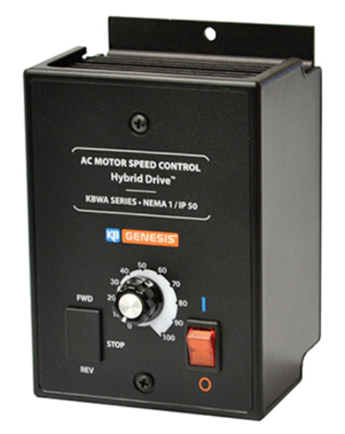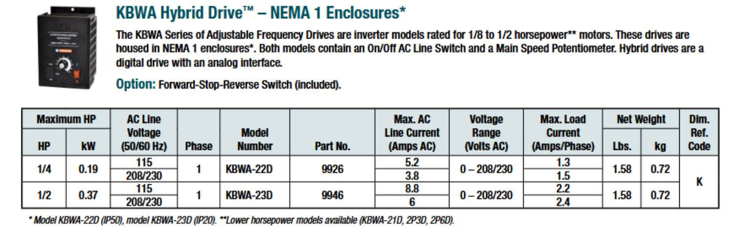 The KBWA Series of Adjustable Frequency Drives are inverter models rated for 1/8 to 1/2 horsepower** motors. These drives arehoused in NEMA 1 enclosures*. Both models contain an On/Off AC Line Switch and a Main Speed Potentiometer. Hybrid drives are adigital drive with an analog interface.