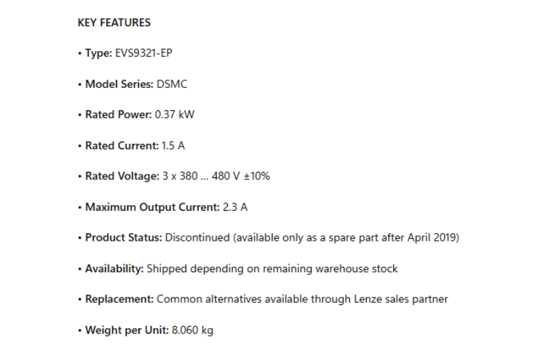 Lenze EVS9321-EP DSMC Drive – 0.37 kW, 3x380-480 V, 2.3 A (Discontinued Spare Part)