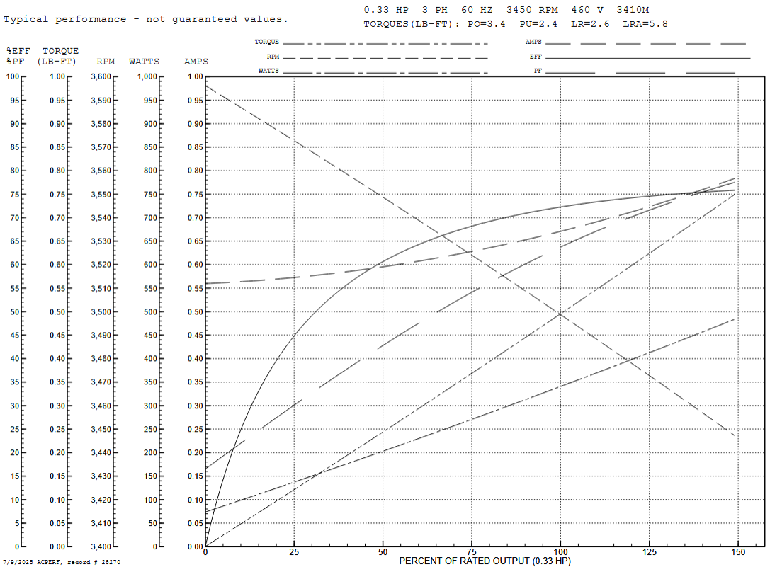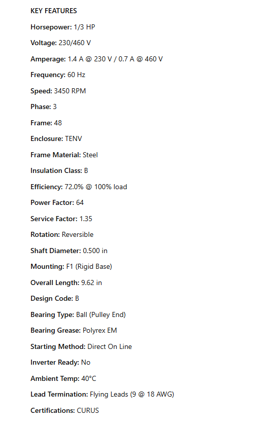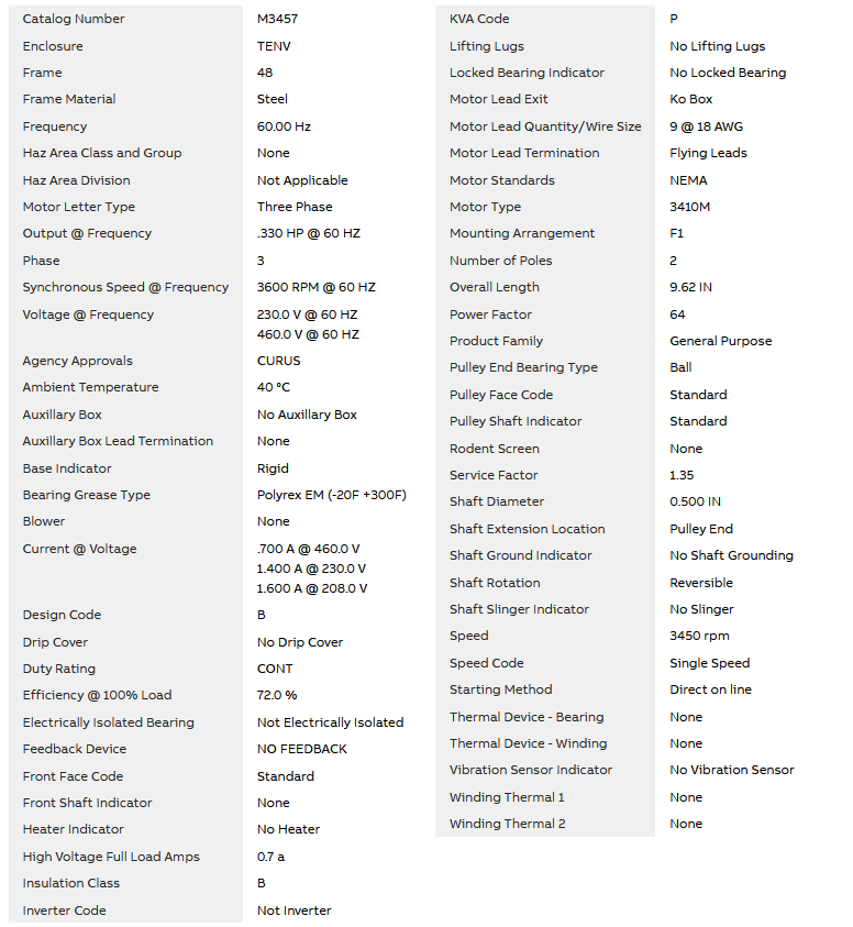 M3457, .33Hp, 3450 RPM, 230/460V 3PH, 60HZ ,48, 3410M, TENV, F1