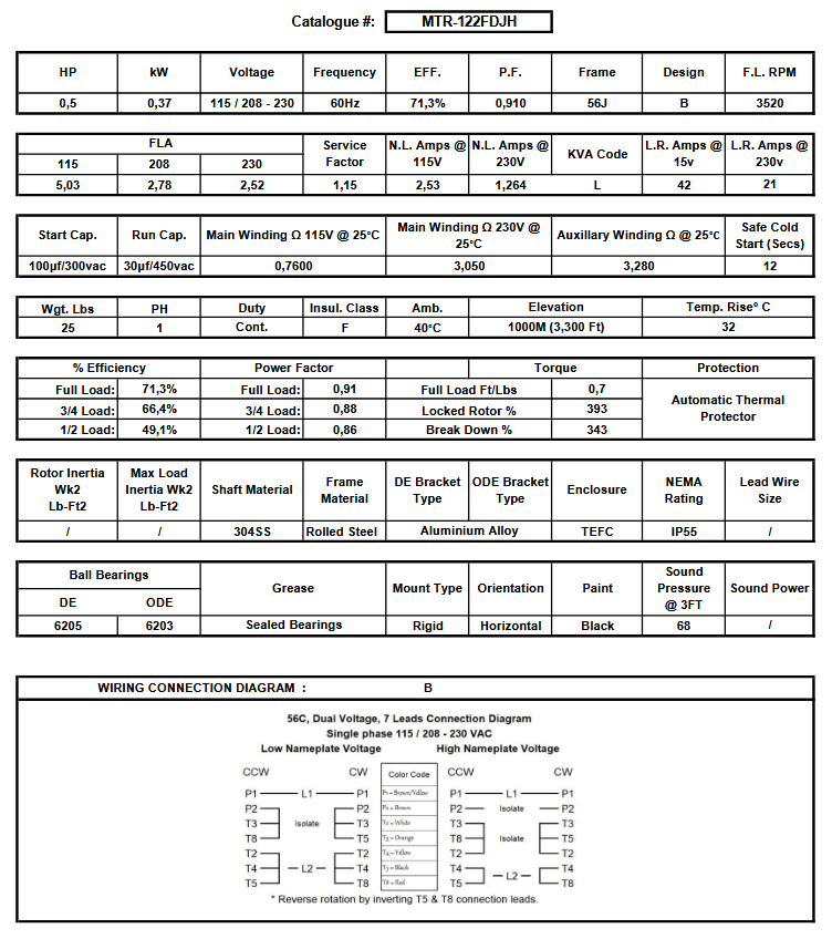 MTR-122FDJH, 1/2Hp, 3520 RPM, 115/230V, 1PH, 60Hz, TEFC, Frame 56J, IP 55 est en rupture de stock et sera expédié dès qu’il sera de retour en stock.