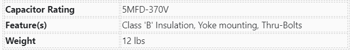 Feature(s) | Class 'B' Insulation, Yoke mounting, Thru-Bolts |