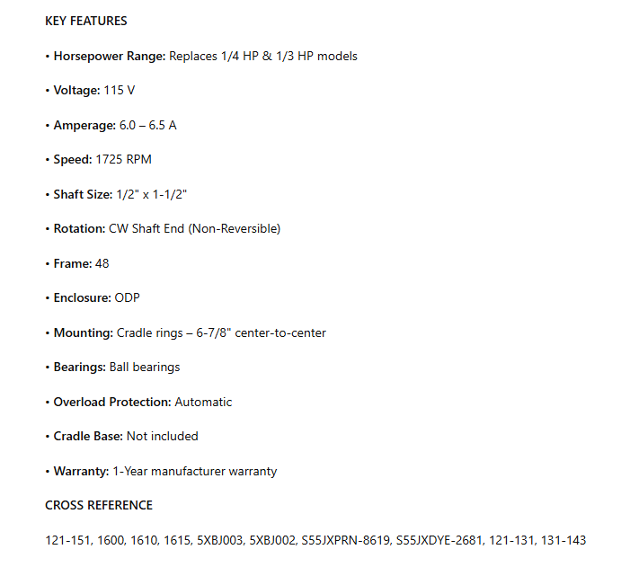 • Horsepower Range: Replaces 1/4 HP & 1/3 HP models