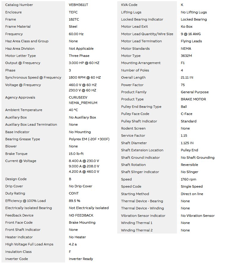VEBM3611T, 3Hp, 208-230/460V, 1760RPM, 3PH, 60HZ, 182TC, 3632M, TEFC, F1
