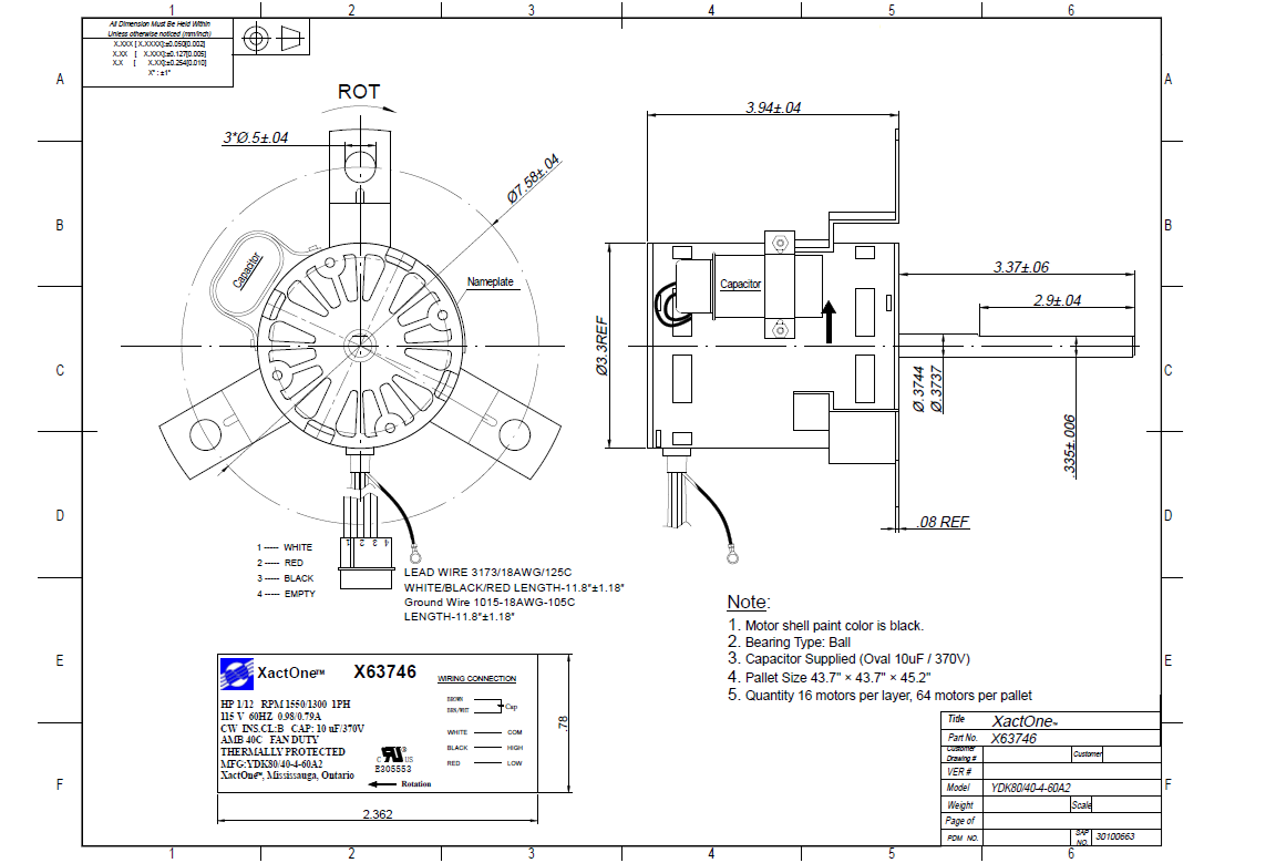 X63746, 1/12Hp, 1500 Rpm, 115 Volts, 63746-0, D0746, OPV746,