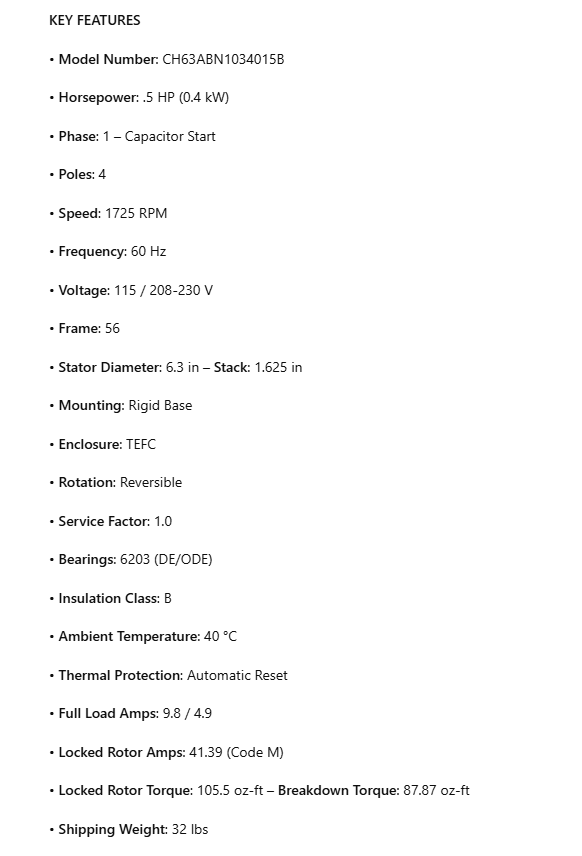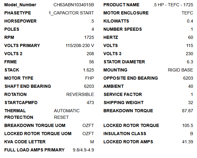 Locked Rotor Torque: 105.5 oz-ft – Breakdown Torque: 87.87 oz-ft