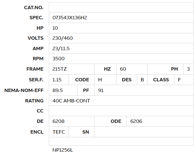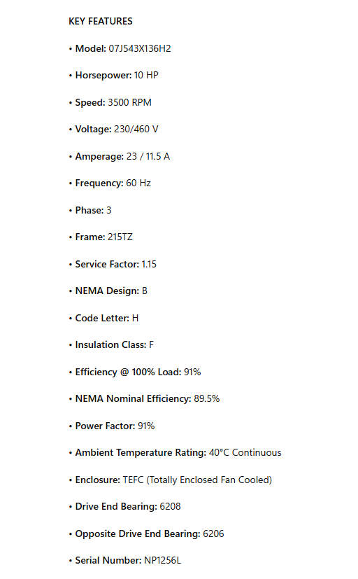 07J543X136H2, 10Hp, 3500RPM, 230/460V, 3Ph, 60HZ, Frame 215T, Special Heater 115V + Thermostat TECF