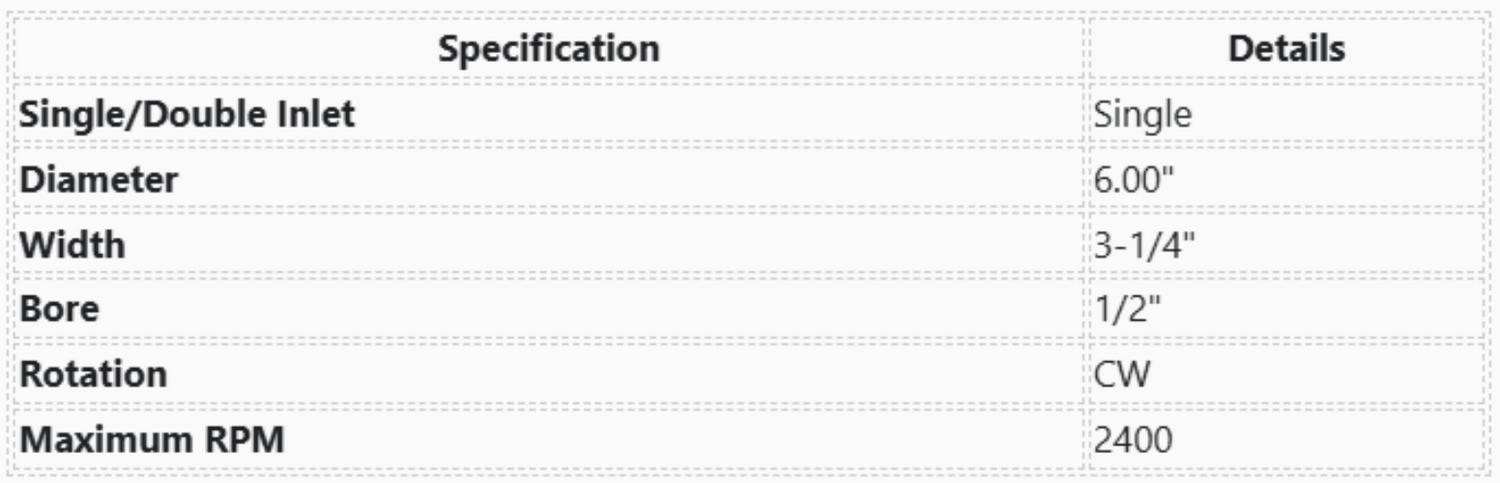 1-6058, Fasco, Blower Wheel, 6" diameter, 3-1/4" width, CW, 2400 Rpm,