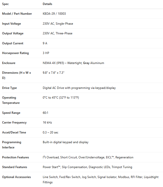 10003, (KBDA-29) Digital AC Drive 3Hp 9A 230V 1PH Input 230V 3PH Output NEMA 4X Enclosure - Gray
