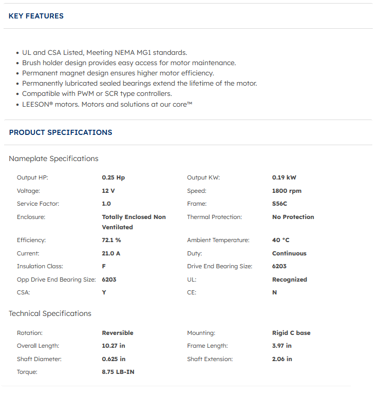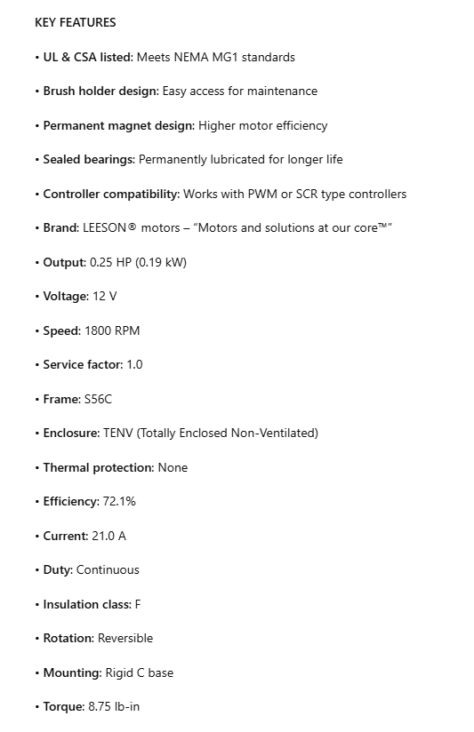 108045.00, Low Voltage Motor, 0.25Hp, 12 V, 1800 RPM, S56C Frame, TENV, C4D17NK5E