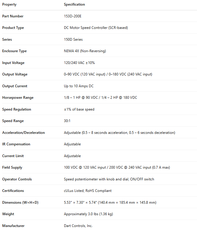 153D-200E, 153D Series 120/240VAC 90VDC (1/8-1Hp) / 180VDC (1/4-2Hp) 10ADC Non-Reversing Nema 4X