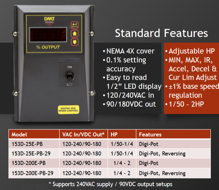 Now, you can have all the advantages of a digital control without the need to install an encoder. The 153D-PB Series adds the accuracy and repeatability of a digital pushbutton speed pot to our best and latest DC drive.