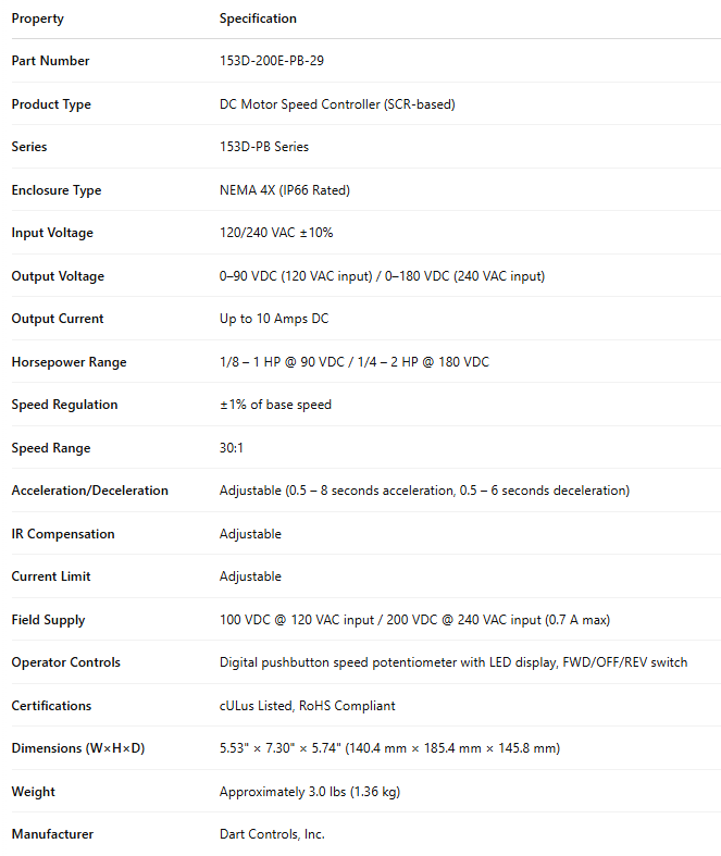 153D-200E-PB-29, 153D-PB Series 1/8Hp-2Hp 90-180VDC Digital Pot Led Display Reverse Ip66/Nema4x is backordered and will ship as soon as it is back in stock.