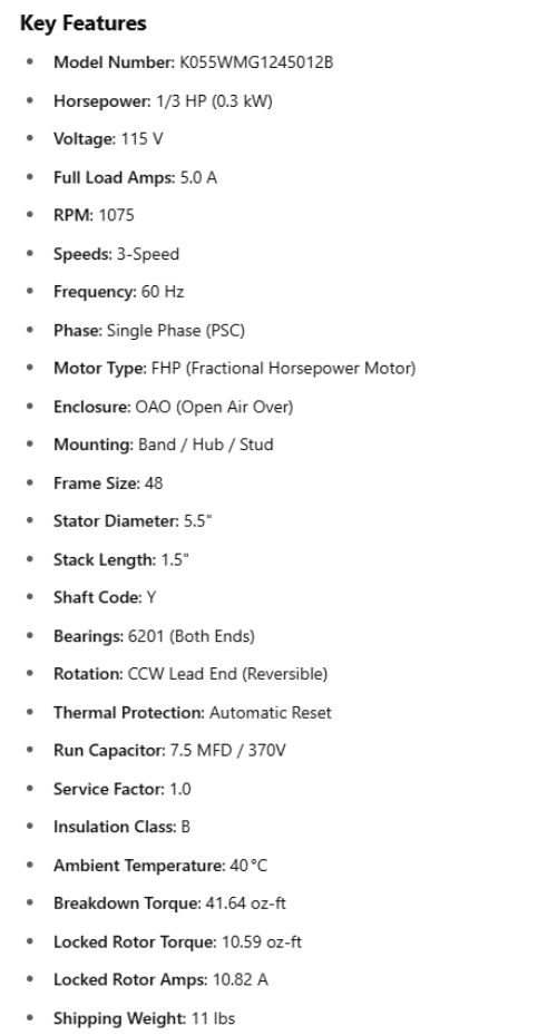1864,Us Motors, Nidec, K055WMG1245012B,EM3585,Century,Replaces A.O. Smith DL1036, Diversitech WG480585, Diversitech 1864, Fasco D727, Embraco E203, GE3585, Marathon X0023, ECONOMASTER EM3585, Rotom, DD-3585, Universal Electric 532, Rotom R43585