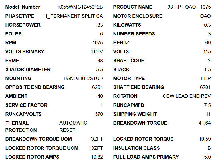1864,Us Motors, 1/3Hp,1075 Rpm,115V,Fr:48,Odp,K055WMG1245012B,EM3585,
