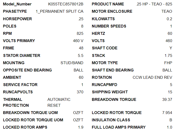 1880, US Motors, 1/4Hp, 825 Rpm, 208-230/460Volts, Frame:48Y,Enc:TEAO,