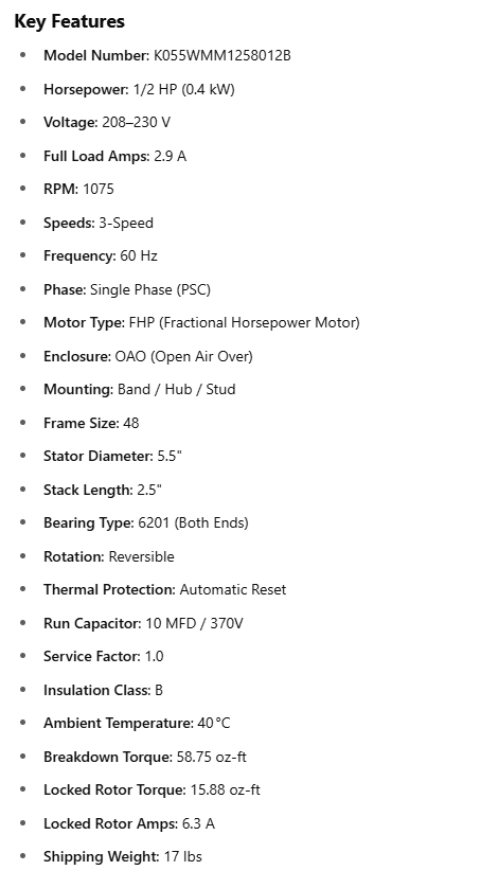 1973 US Motor, 1/2Hp, 1075 Rpm, 208-230V, Fr:48, FD1056, K055WMM1258012B, repl. X005,Marathon