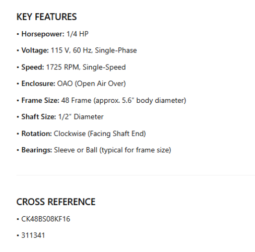 311341P, OEM Replacement, 1/4Hp, 1725 RPM, 115V, CW, OAO , Fr. 48