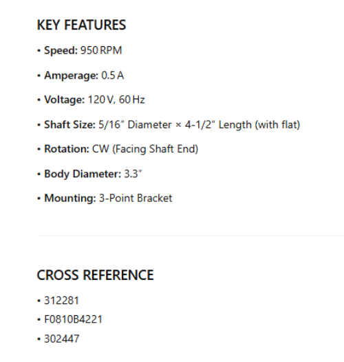 312281M, OEM Replacement, 950 RPM, 120V, CW, 3.3″ Dia.