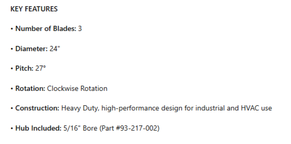 32427-CW-HD-5/16, Fan Blade, 3 Blades, 24" Diameter, 27° Pitch, Clockwise Rotation, Bore 5/16" , Heavy Duty is backordered and will ship as soon as it is back in stock.