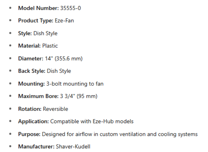 35555-0, Plastic Eze-Fan - 14"( 355.6 mm ) Dish Style is backordered and will ship as soon as it is back in stock.