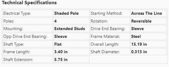 Electrical Type: | Shaded Pole | Starting Method: | Across The Line |