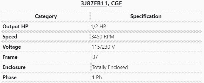3J87FB11, CGE, 1/2Hp, 3450 Rpm, 115-230 Volts, Fr:37, Totally Enclosed, is backordered and will ship as soon as it is back in stock.