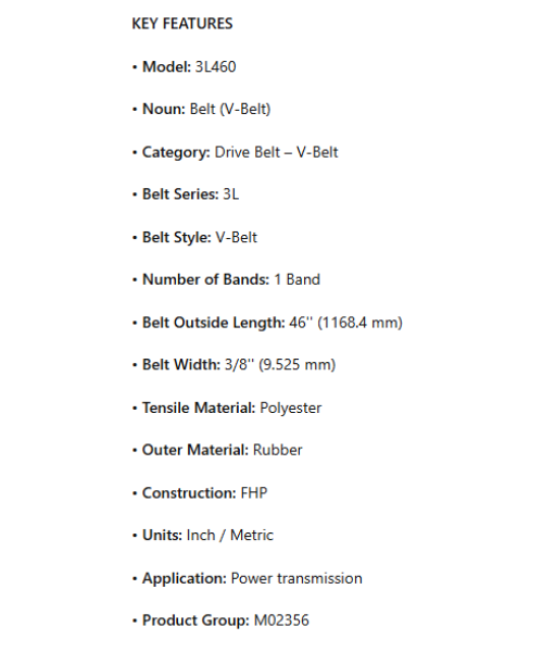 3L460, V-Belt; 3L Series; 46" Belt Outside Length; 3/8" Belt Width; 1 Band; Polyester Tensile Material; Rubber Outer Material is backordered and will ship as soon as it is back in stock.