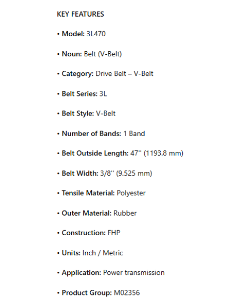 3L470, V-Belt; 3L Series; 47" Belt Outside Length; 3/8" Belt Width; 1 Band; Polyester Tensile Material; Rubber Outer Material is backordered and will ship as soon as it is back in stock.