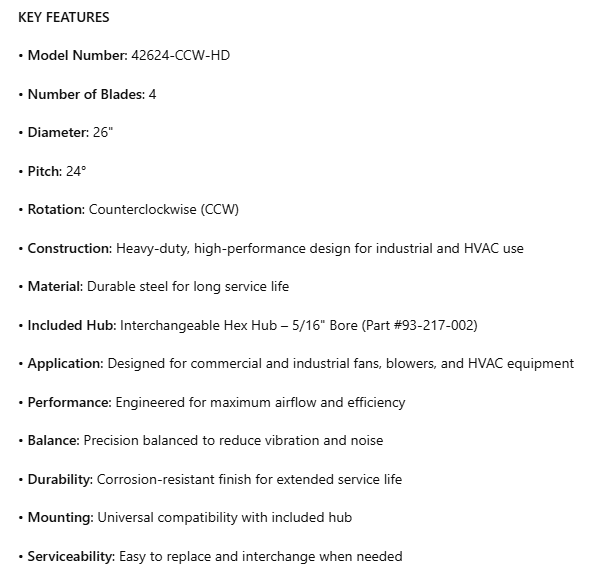 42624CCW-HD+5/16, Fan Blade, 4 Blades, 26" Diameter, 24° Pitch, Counterclockwise Rotation, Interchangeable Hex Hubs Bore 5/16", Heavy Duty is backordered and will ship as soon as it is back in stock.