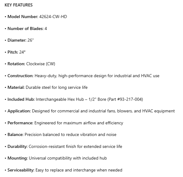 42624CW-HD+1/2, Fan Blade, 4 Blades, 26" Diameter, 24° Pitch, Clockwise Rotation, Interchangeable Hex Hubs 1/2", Heavy Duty is backordered and will ship as soon as it is back in stock.