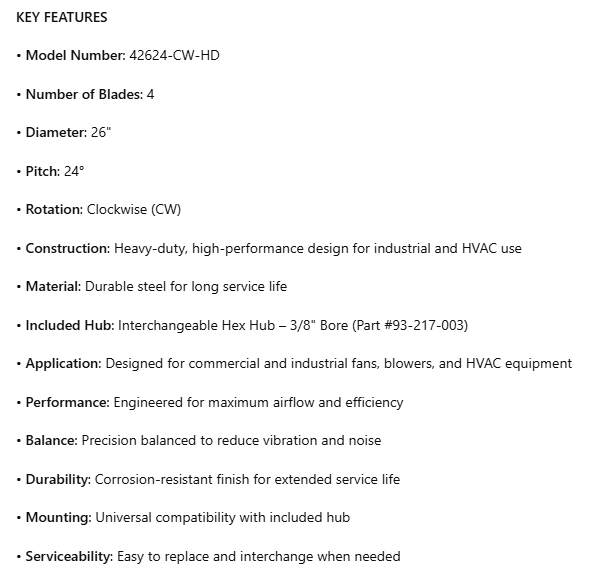 42624CW-HD+3/8, Fan Blade, 4 Blades, 26" Diameter, 24° Pitch, Clockwise Rotation, Interchangeable Hex Hubs 3/8", Heavy Duty is backordered and will ship as soon as it is back in stock.