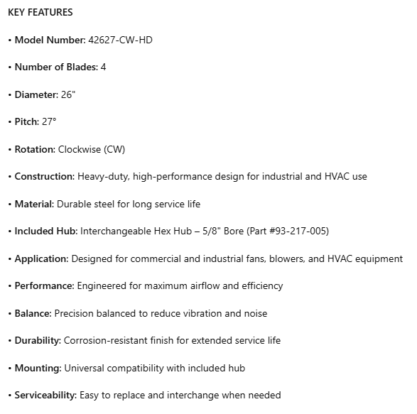 42627-CW-HD+5/8, Fan Blade, 4 Blades, 26" Diameter, 27° Pitch, Clockwise Rotation, Interchangeable Hex Hubs Bore 5/8", Heavy Duty is backordered and will ship as soon as it is back in stock.