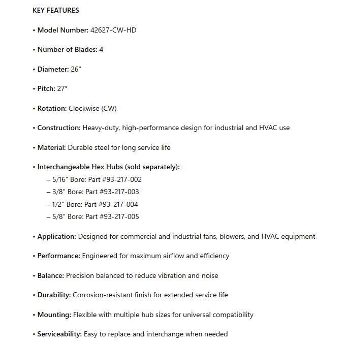 42627-CW-HD, Fan Blade, 4 Blades, 26" Diameter, 27° Pitch, Clockwise Rotation, Interchangeable Hex Hubs, Heavy Duty is backordered and will ship as soon as it is back in stock.