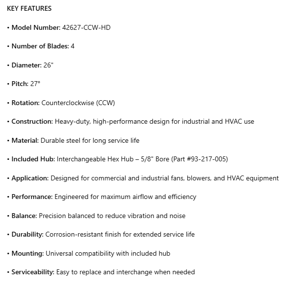 42627CCW-HD+5/8, Fan Blade, 4 Blades, 26" Diameter, 27° Pitch, Counterclockwise Rotation, Interchangeable Hex Hubs Bore 5/8", Heavy Duty is backordered and will ship as soon as it is back in stock.
