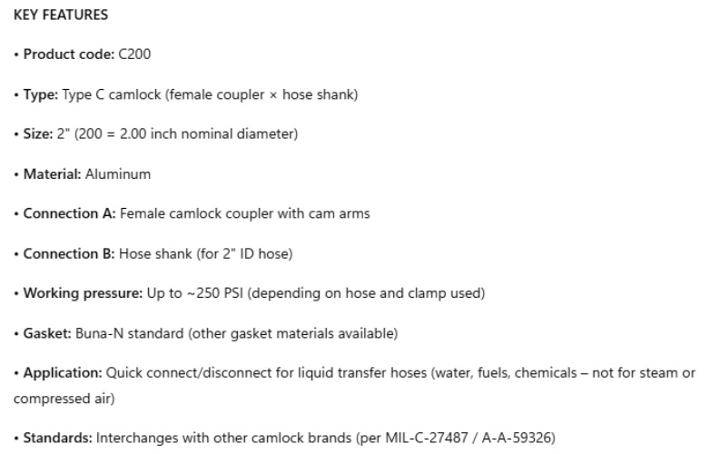 • Standards: Interchanges with other camlock brands (per MIL-C-27487 / A-A-59326)