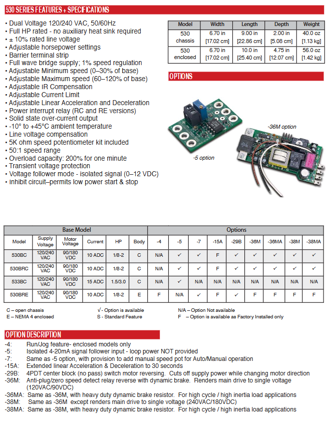 530BRE-36M, Drive Dc 1/8-1Hp 115vac Nema 4 Forward-Reverse W/Dynamic Brake And Zero Speed Detect