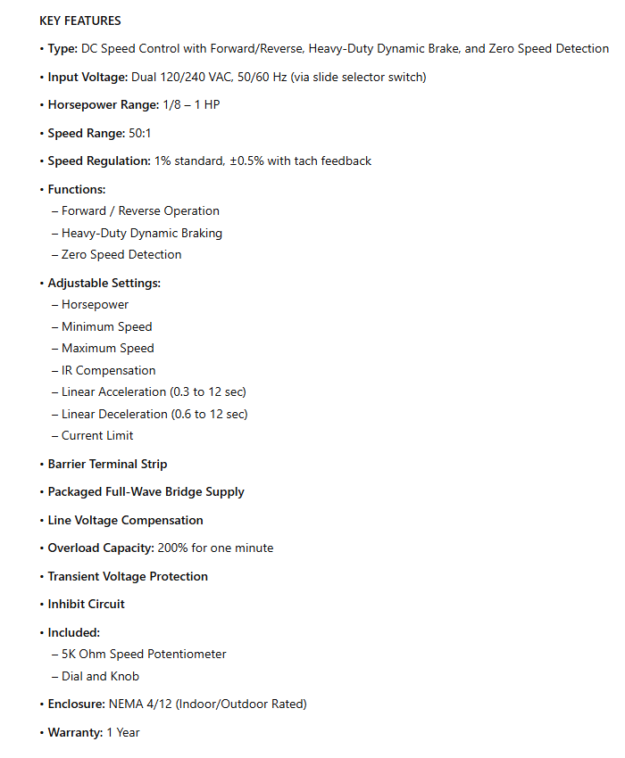 • Type: DC Speed Control with Forward/Reverse, Heavy-Duty Dynamic Brake, and Zero Speed Detection
