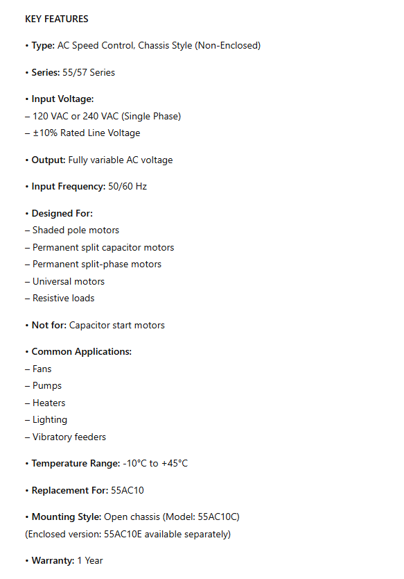 • Type: AC Speed Control, Chassis Style (Non-Enclosed)