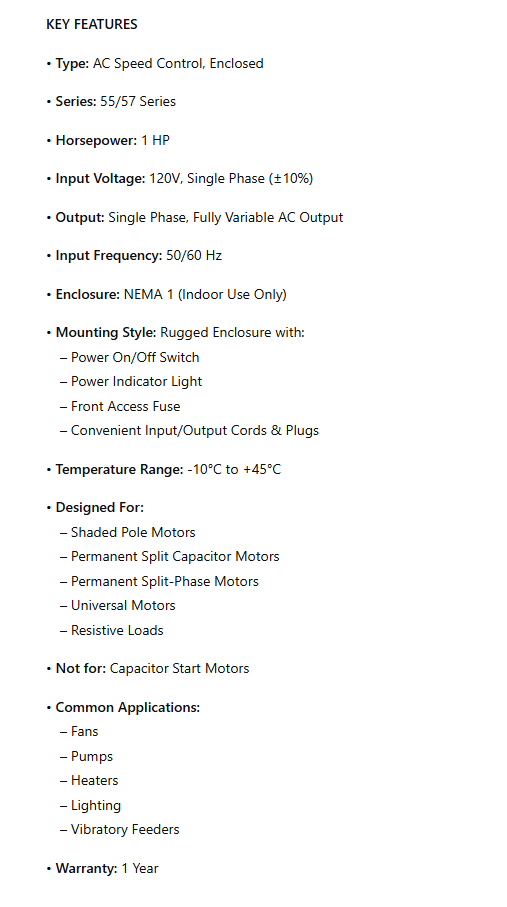 A dependable, economical and compact variable AC voltage supply manufactured especially for the vibratory feeder, fan, pump, heating, and lighting industries. All models feature single-phase AC input and fully variable AC output. The enclosed version comes with a rugged housing, power on/off switch, power on indicator lamp, front access fuse, as well as convenient input and output cords and plugs. The heart of the control is a triac fired in a manner to adjust phase and thereby vary speed. The 55 Series is designed to work with shaded pole, permanent split capacitor, universal motors or any resistive load. It is not designed for capacitor start motors.