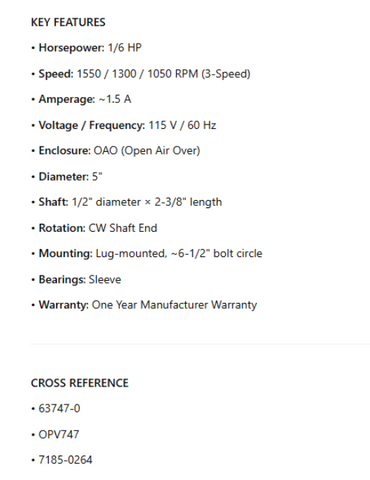 63747, OEM Replacement, 1/6Hp, 1550 / 1300 / 1050 Rpm, 115 V, OAO, CWSE, 5" Dia.