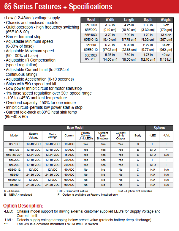 drive saves energy, increasing time between charges plus extends the overall life of the battery. The 65 Series are also used with low voltage power supply (typically 12-24VDC) due to the size of the motor being used.