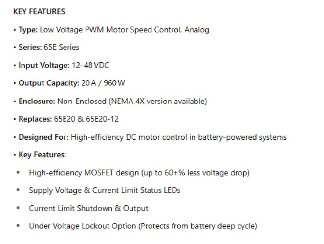 The 65 Series from Dart are high performance PWM drives for low voltage DC motors. Used many times in applications with battery voltage as the supply the PWM