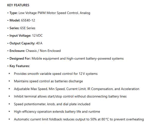 • Type: Low Voltage PWM Motor Speed Control, Analog