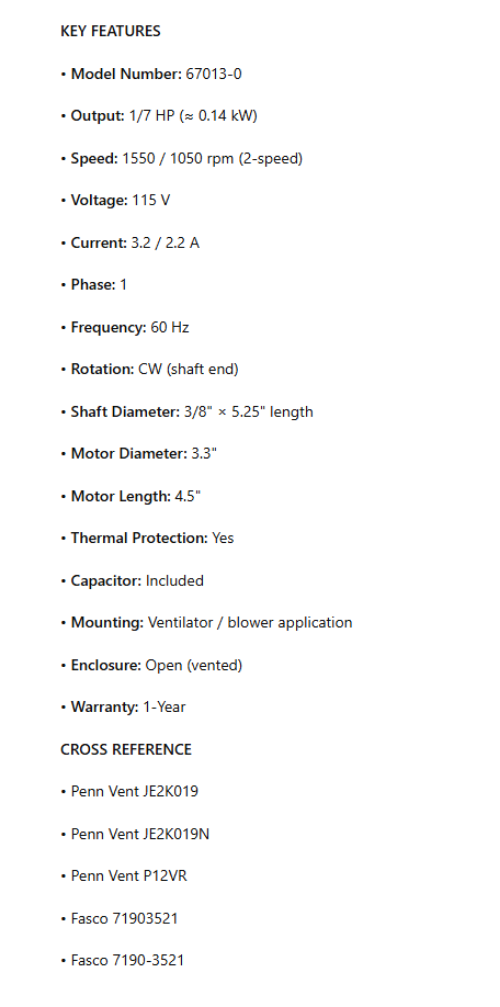 67013-0, 1/7Hp, 1550/1050 RPM, 115V, 1PH, 3.3" Dia. is backordered and will ship as soon as it is back in stock.