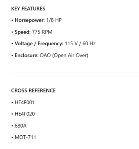 680P, OEM Replacement, 1/8Hp, 775 Rpm, 115V, 60 Hz, OAO is backordered and will ship as soon as it is back in stock.