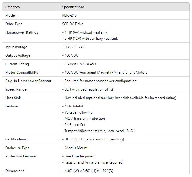 9428, (KBIC-240) SCR DC Drive 2Hp 12A With Heat Sink 1Hp 6A Without Heat Sink 230VAC 1PH Input 180VDC Output Chassis